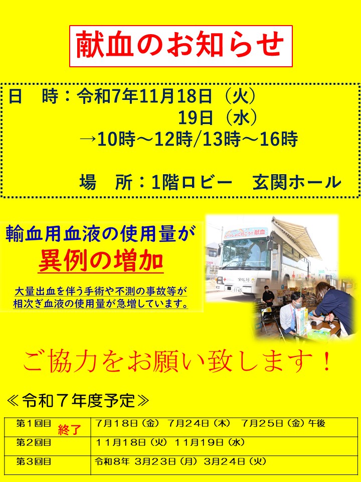 当院にて、下記日程で献血を行いますのでお知らせ致します。