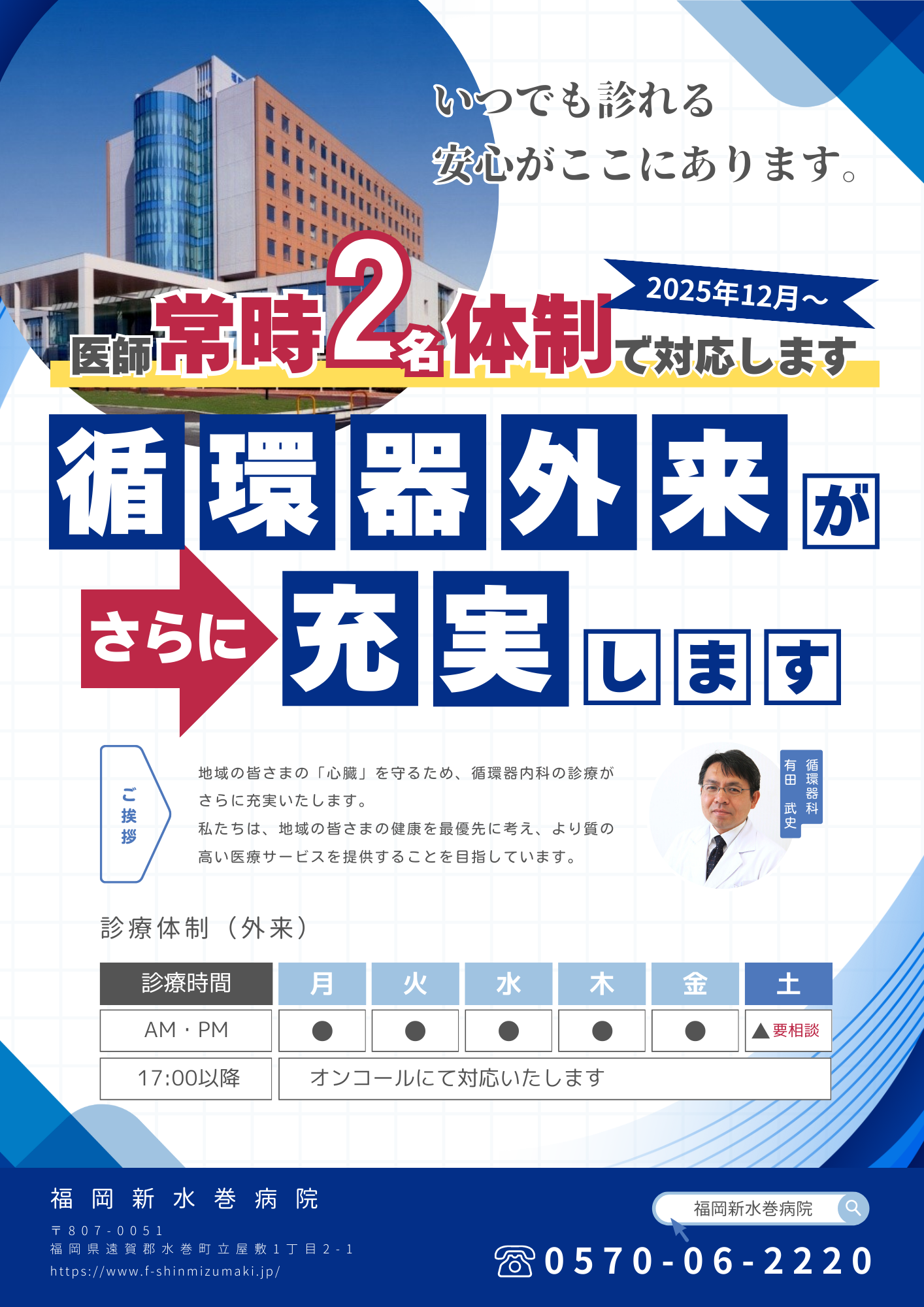 2025年12月1日より、循環器内科医師が常時2名体制となりました。さらに、地域医療に貢献してまいります。